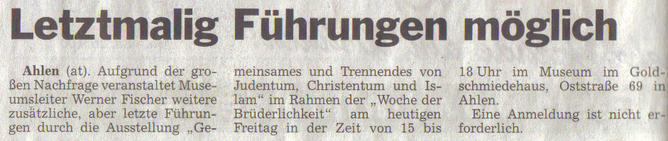 Heute treffen wir uns im Museum im Goldschmiedehaus zu zwei Abschlußveranstaltungen. Zum einen beenden wir heute die erfolgreiche Ausstellung ISLAM und türkisches Leben, die übergroßes Interesse in Ahlen und der Region fand und die Woche der Brüderlichkeit 2010.