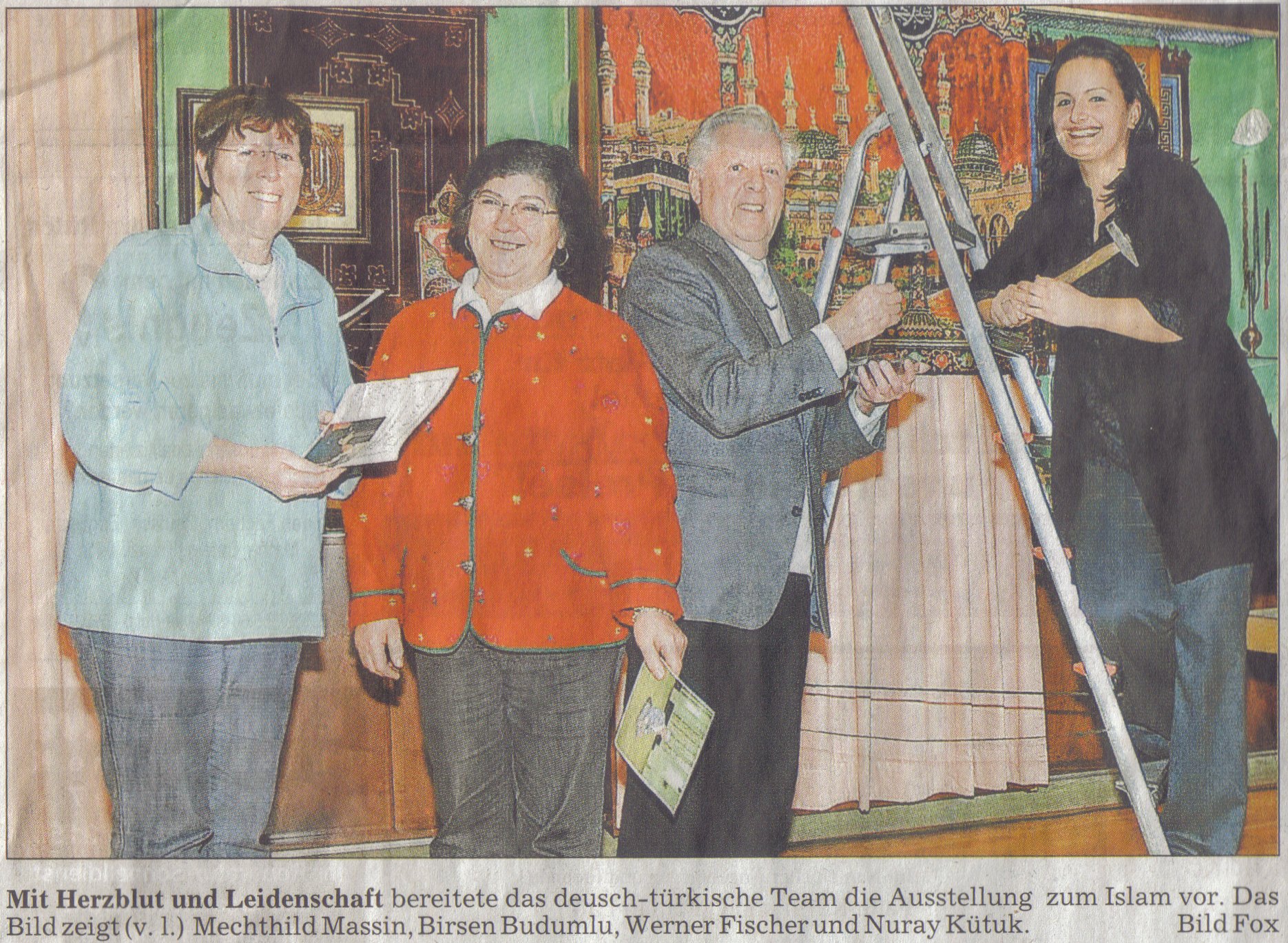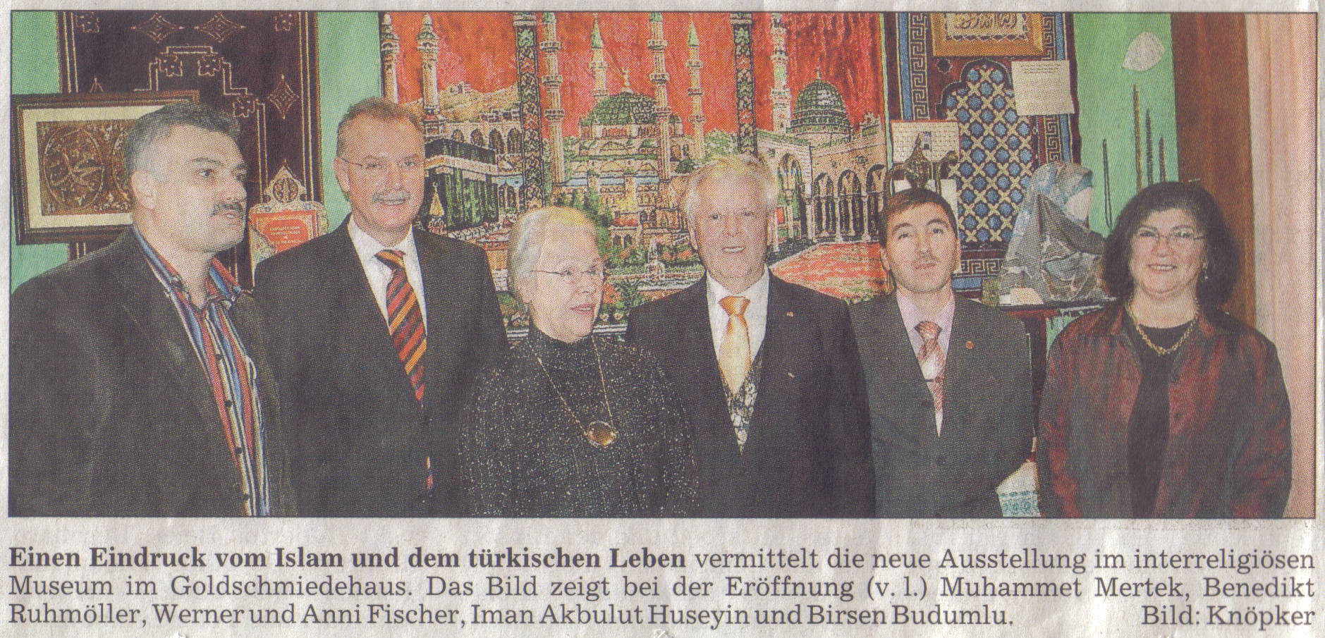 nissage begrüßen: Mit dem Ausklang der Veranstaltungsreihe "Woche der Brüderlichkeit" schloss zugleich die vielbeachtete Ausstellung Islam im Museum ihre Pforten. Die Anerkennung, welche die Ausstellung zur "Politisch-kulturellen Woche Türkei" der Volkshochschule gefunden hat, fasste Fischer in dem Satz eines zehnjährige!! türkischen Jungen zusammen der ihm nach einer Führung durch die Ausstellung sagte "Danke, Herr Fischer." Das sei für ihn das größte Lob gewesen.